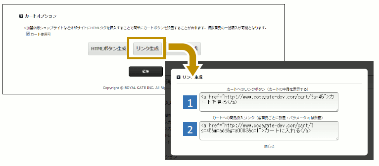 「商品管理」よりカートボタンを設置したい商品の「商品ID」をクリックして編集画面を開きます。一番下のほうに3つ並んだボタンから「リンク生成」をクリックするとコードが表示されますので、そのコードをコピーしてサイトに埋め込みます。