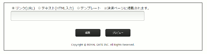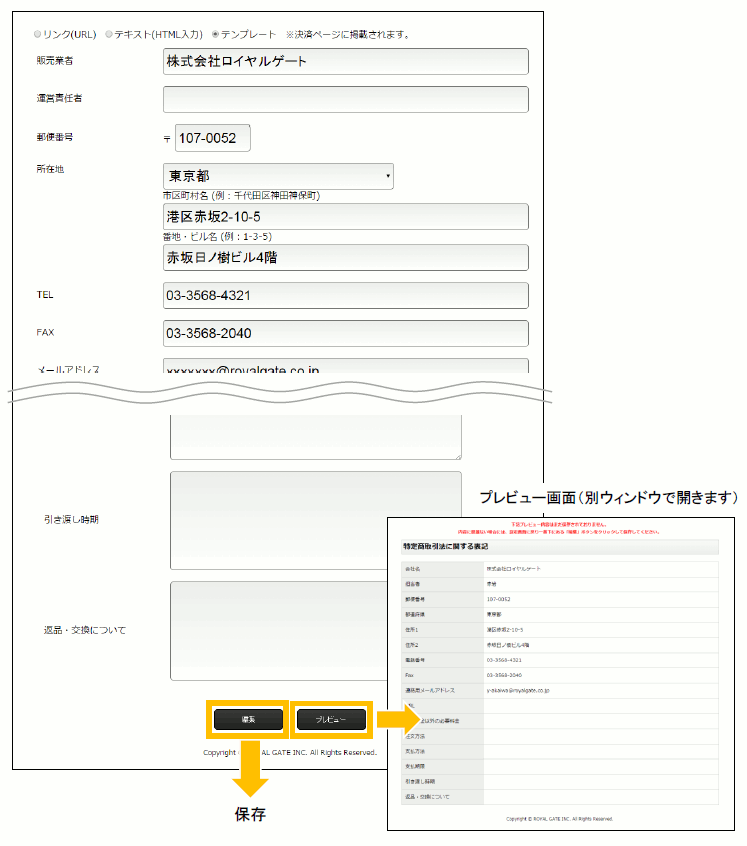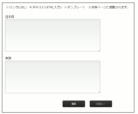 「特定商取引に関する表記」の内容をテキストエリアに記入します。HTMLタグを使用することが可能です。