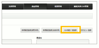 管理画面の「商品管理」ページに入り、右上に表示されたサブメニューより「CSV商品一括登録」を選択して編集ページに入ってください。