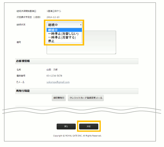 | 停止 | 継続決済を停止します。一度停止にしたデータはもとに戻すことはできません。 |