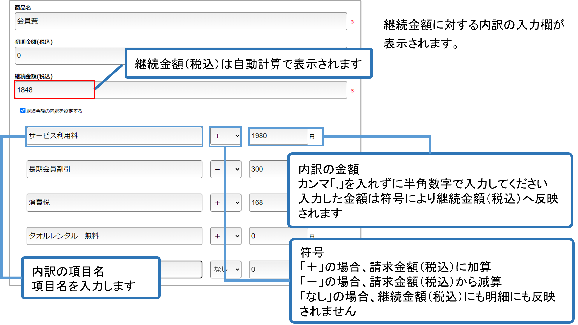 「継続金額の内訳を設定する」にチェックを入れることで、内訳を設定することが可能です。