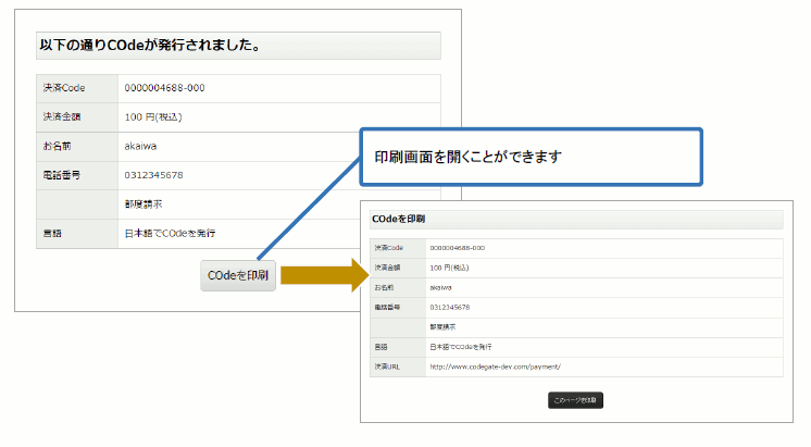 そのため、お客様には「COdeGATE決済URL」と「COde」をご案内してください。