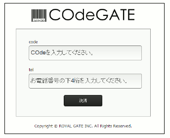 COdeGATE決済画面で、発行されたCOdeとCOde発行時に登録したお客様のお電話番号下4桁を入力すると決済画面へ進みます。