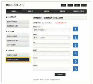 グローバルメニューの「請求管理」を選択していただき、「COde請求」以下にある「登録商品から請求」を選択して編集画面を開きます。